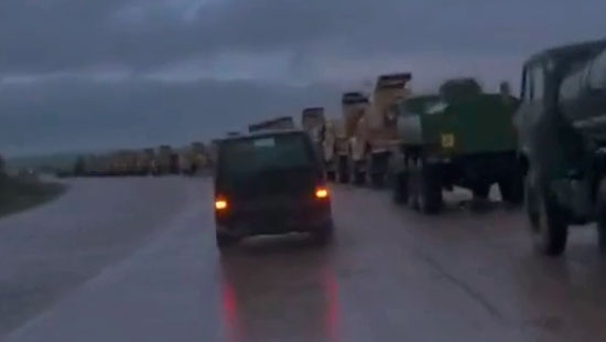 «На новом ролике бронеавтомобили Oshkosh M-ATV и топливозаправщики едут по дороге в неизвестном месте. В кадр снимающего попали не менее 30 единиц техники», — говорится в публикации «РВ».