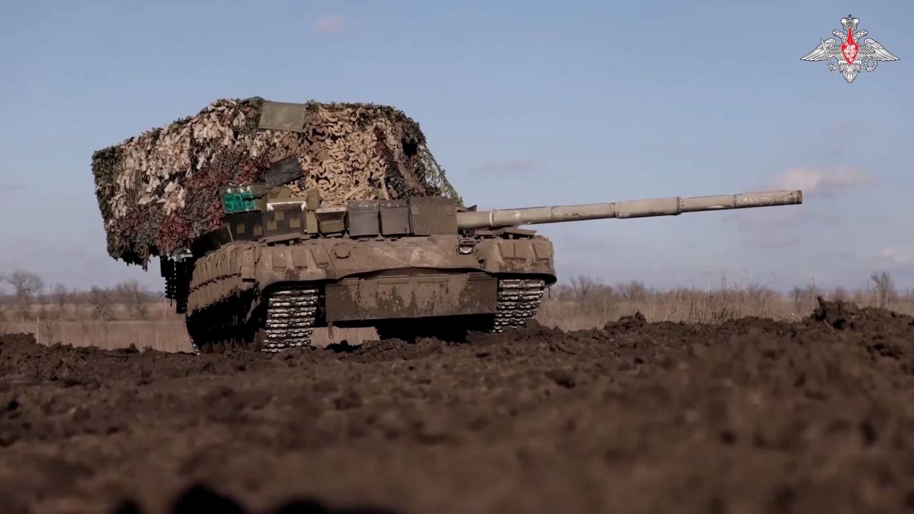 Обозреватели Telegram-канала «Военный осведомитель» опубликовали фотографию российского танка Т-80БВМ с установленным на башне «царским козырьком». Боевая машина передвигалась по одному из направлений передовой в СВО. «Царский козырек» установлен на танк для обеспечения максимальной защиты путем маскировки, а также в целях безопасности экипажа, который находится внутри боевой машины.