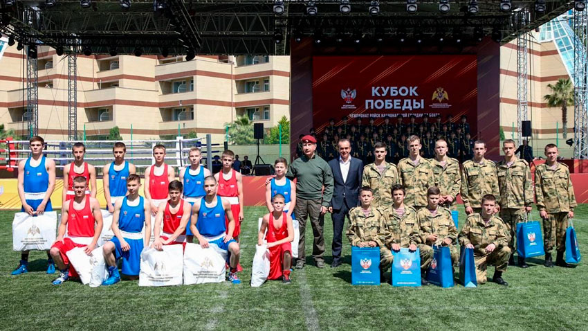В рамках «Кубка Победы» глава ведомства вместе с губернатором Краснодарского края вручили призы воспитанникам детских секций бокса и рукопашного боя, выступивших перед зрителями с показательной программой. Генерал армии Виктор Золотов поблагодарил юных спортсменов и напутствовал их на продолжение тренировок и стремление к будущим победам.