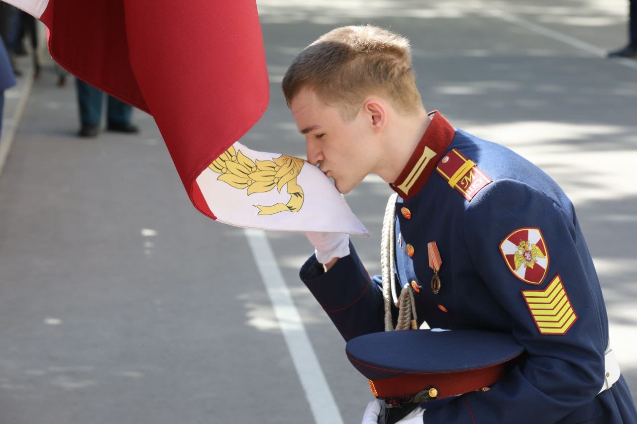 Под музыкальное сопровождение оркестра Росгвардии знаменные группы пронесли Государственный флаг Российской Федерации, Знамя войск национальной гвардии Российской Федерации и Знамя училища, после чего каждый из выпускников преклонил колено перед главным символом учебного заведения. Этот воинский ритуал имеет большое значение для кадет – знамя училища олицетворяет священный долг защиты Отечества и принадлежности к войскам национальной гвардии Российской Федерации.