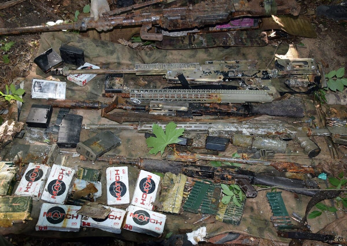 В оборудованном под слоем грунта тайнике находились две 7,62 мм немецких снайперских винтовки Sauer 202, 7,62 мм снайперская винтовка Steyr производства Австрии и украинская снайперская винтовка 338 калибра TOB, ручной противотанковый гранатомёт, АГС-17, пулемет Калашникова, а также боеприпасы для стрелкового вооружения западного образца.