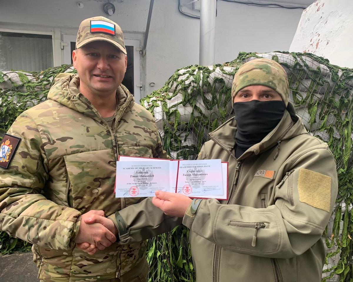 Заместителю командира бригады «Барс-Курск» Тимуру Сыртланову вручили диплом профессора Академии военных наук