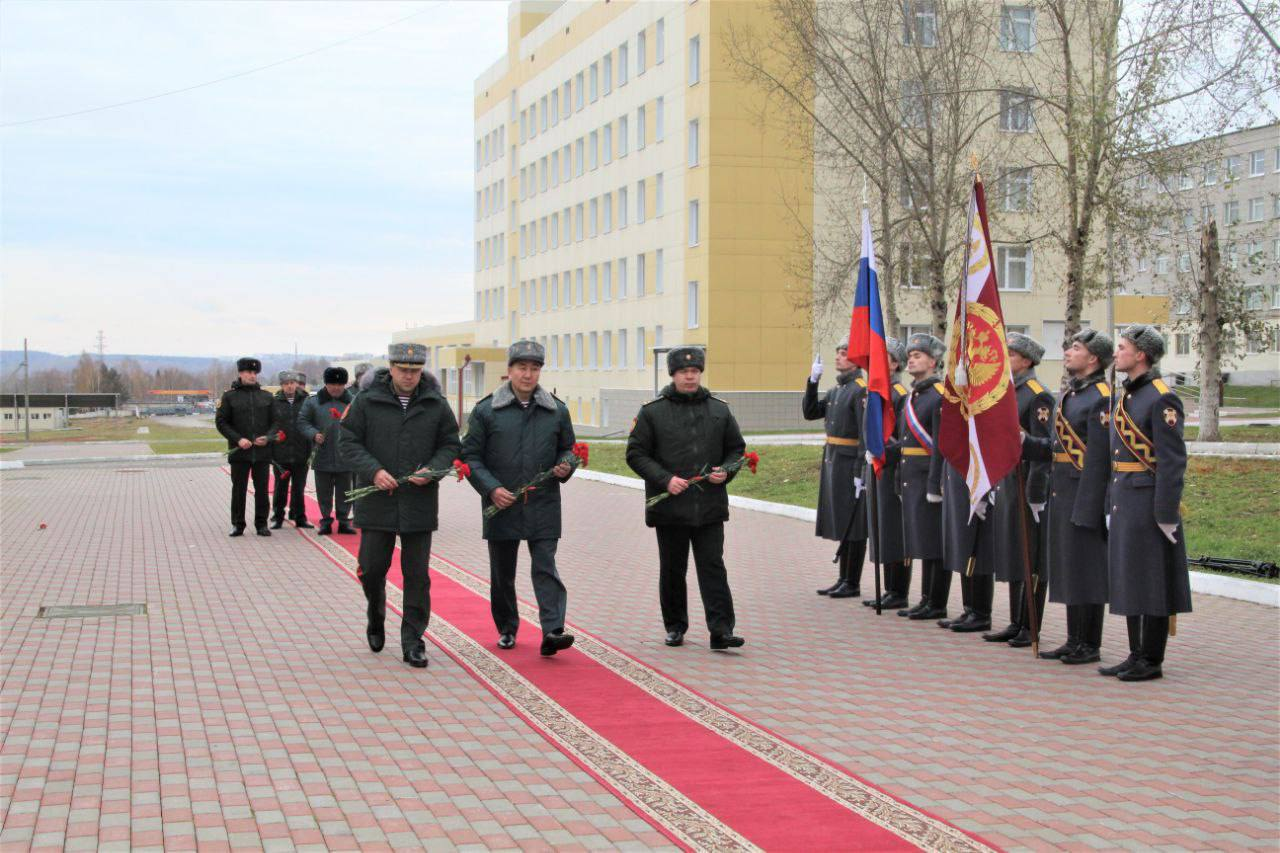 В рамках приема делегации прошла церемония возложения цветов и венков к памятнику выпускникам военного института, погибшим при исполнении воинского долга. Первый венок по традиции вынесли курсанты военного института. Далее цветы возложили начальник Управления образования