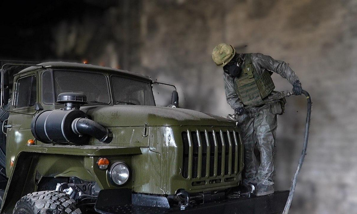 Служебный автомобиль отогнали в безопасное место. Под прикрытием огнемётной пары расчёт радиационной и химической разведки произвёл необходимые измерения и, обнаружив заражение, с помощью авторазливочной станции АРС-14 приступил к специальной обработке заражённого автомобиля.
