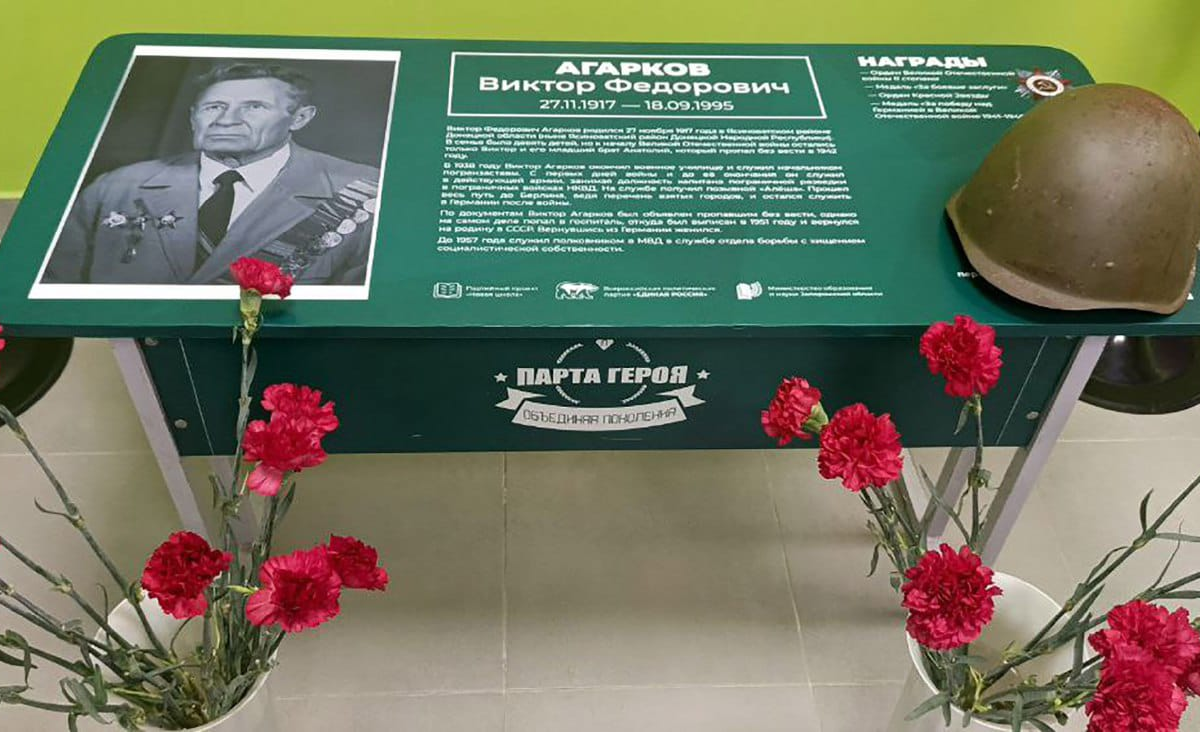 В одной из школ Энергодара при содействии Росгвардии открыта «Парта Героя» как дань уважения ветерану Великой Отечественной войны, офицеру НКВД, капитану пограничной разведки Виктору Агаркову. На торжественном открытии присутствовали представители Росгвардии, администрации города, руководство школы, преподавательский состав и ученики.