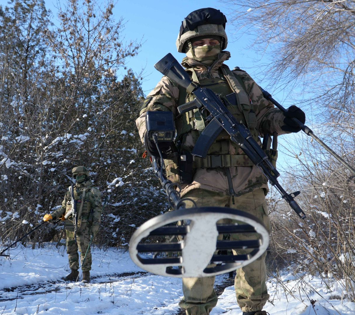 В составе инженерно-разведывательного дозора несколько сапёров с миноискателями, металлодетекторами и щупами. Следом за ними идут кинолог с минно-разыскной собакой, которая с помощью своего обоняния «проверяет» работу приборов. Сегодня работу специалистам осложняет выпавший за ночь снег.