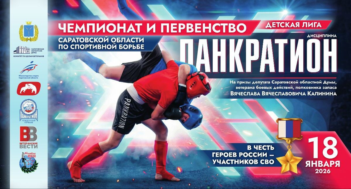 18 января в Саратовской области стартуют Чемпионат и Первенств региона по спортивной борьбе (дисциплина панкратион) в честь саратовцев, Героев России – участников СВО — на призы депутата Саратовской областной Думы, ветерана боевых действий, полковника запаса Вячеслава Калинина.