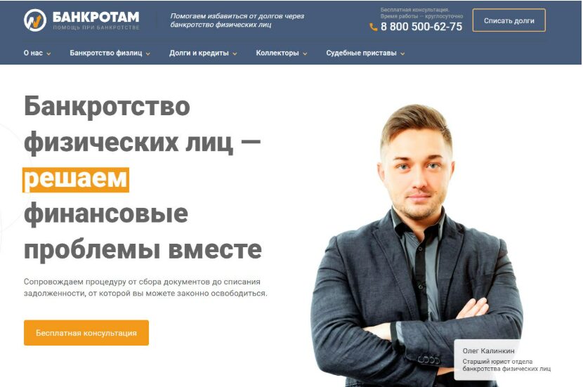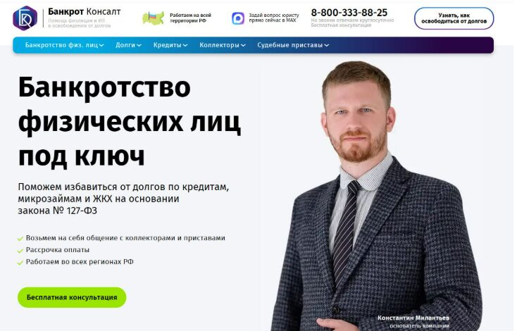 Юридическая компания «Банкрот Консалт» предоставляет комплексные услуги по списанию долгов по кредитам, микрозаймам и коммунальным платежам в рамках закона № 127‑ФЗ. Специалисты компании берут на себя взаимодействие с коллекторами и судебными приставами, а участие клиента в суде сведено к минимуму — ваши интересы на заседаниях представляют опытные юристы. «Банкрот Консалт» оказывает услуги по всей территории России.