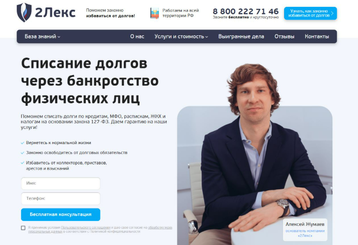 Компания «2Лекс» предоставляет комплексные услуги по банкротству физических лиц, помогая законно списать долги и при этом максимально сохранить имущество клиента. Работа ведётся строго в рамках Федерального закона № 127-ФЗ, что гарантирует юридическую чистоту и безопасность процедуры.